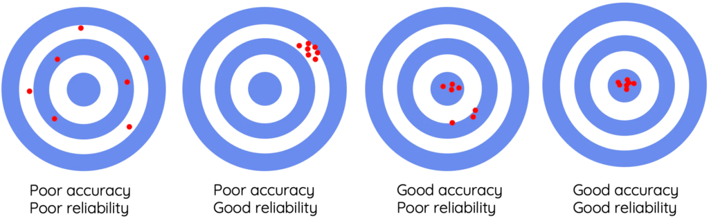 The graphic below shows another visualisation of the concepts of accuracy and reliability.