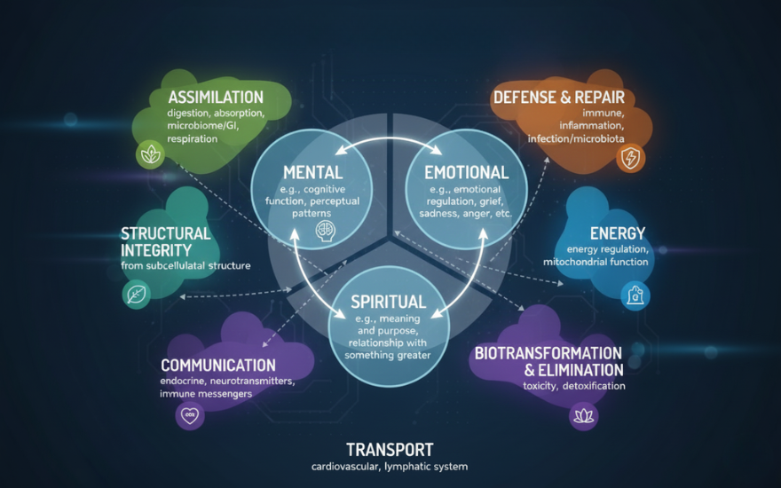 - The body is treated as an interconnected ecosystem. Functional medicine uses tools like the Functional Medicine Matrix to map how genetics, environment, lifestyle, and biological systems interact to affect health.